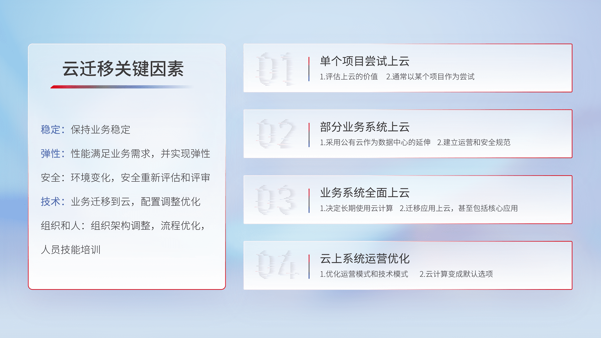 结合实际业务,,从规划设计、、云平台选型、、云原生改造、、数据迁移、、、、集成交付,,迁移全过程为客户识别最佳上云路径,,,,做好风险识别管理,,,,设计网络架构、、、身份权限、、、安全审计合规、、操作审计、、、、日志审计、、、监控告警策略、、、、多站点容灾设计等,,,,对云上基础设施进行整体规划,,提升IT治理水平,,以满足弹性、、、、高可用、、高性能的需求。。