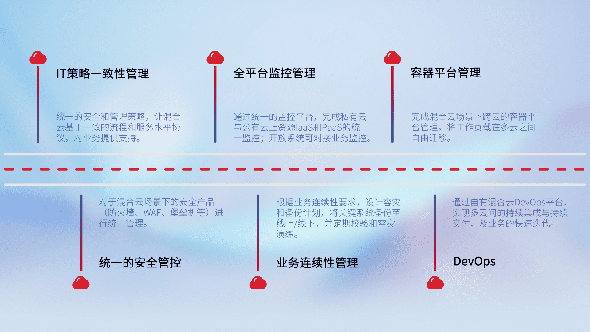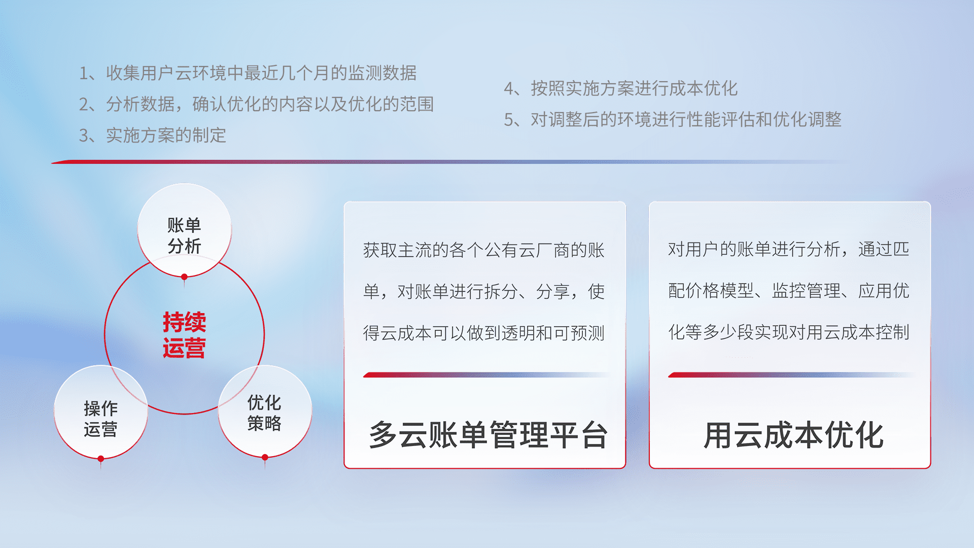 通过多云纳管,,,以统一的资源数据模型把客户的云资源进行抽象和封装,,进而实现对多云资源的统一操作,,,保障云资源管理的可靠性、、稳定性与可用性。。量身定制化运维内容,,配置、、开发运维、、、、补丁管理、、、、备份、、、、监控、、、、认证和访问管理、、、、审计和日常巡检等,,保障在用云过程中的可靠度,,,,稳定度以及高可用率。。。。